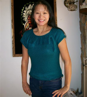 After finishing my Garter Yoke Cardigan, I was looking for an easy project to do. I wanted to make something in turquoise. I saw a beautiful top at the mall in that color and I knew my next project had to be that color. So, I used the yarn that I had bought as a valentine's day gift to myself. I had purchased this pattern last May, it's called the Capped Sleeve Tee by Sirdar. The pattern is fairly easy. It actually went quite fast until I started the neckline. For some reason, probably stress, it took a lot longer. For me stress +knitting usually = disaster. That's what happened here. I had to redo and tear out the neckline countless time. Finally, I thought I was doing it right but it wasn't. I ended up going with the rev st st instead of the garter st as the pattern indicated. I also had a really hard time trying to get the gauge. I figure I would rather have it less "clingy" but even in this size, the top is still very clingy! You can see every bump! Humph! When I thought I was finished, I tried it on. Ugh, it was horrible. The neckline was hanging off my shoulders. It was going into the ugh pile. After a day away, I thought I try to make it work. I decided to do more rev st st and do some decreases. After approx. 7 rows of decreases (with purls between the decreases), I was happy with the results. The neckline has a ruffled look to it which I think it gives it some character. One draw back is that it is form fitting and you can see every line and bump in it! I'm still very happy with the end results and I'm glad I didn't give up.
